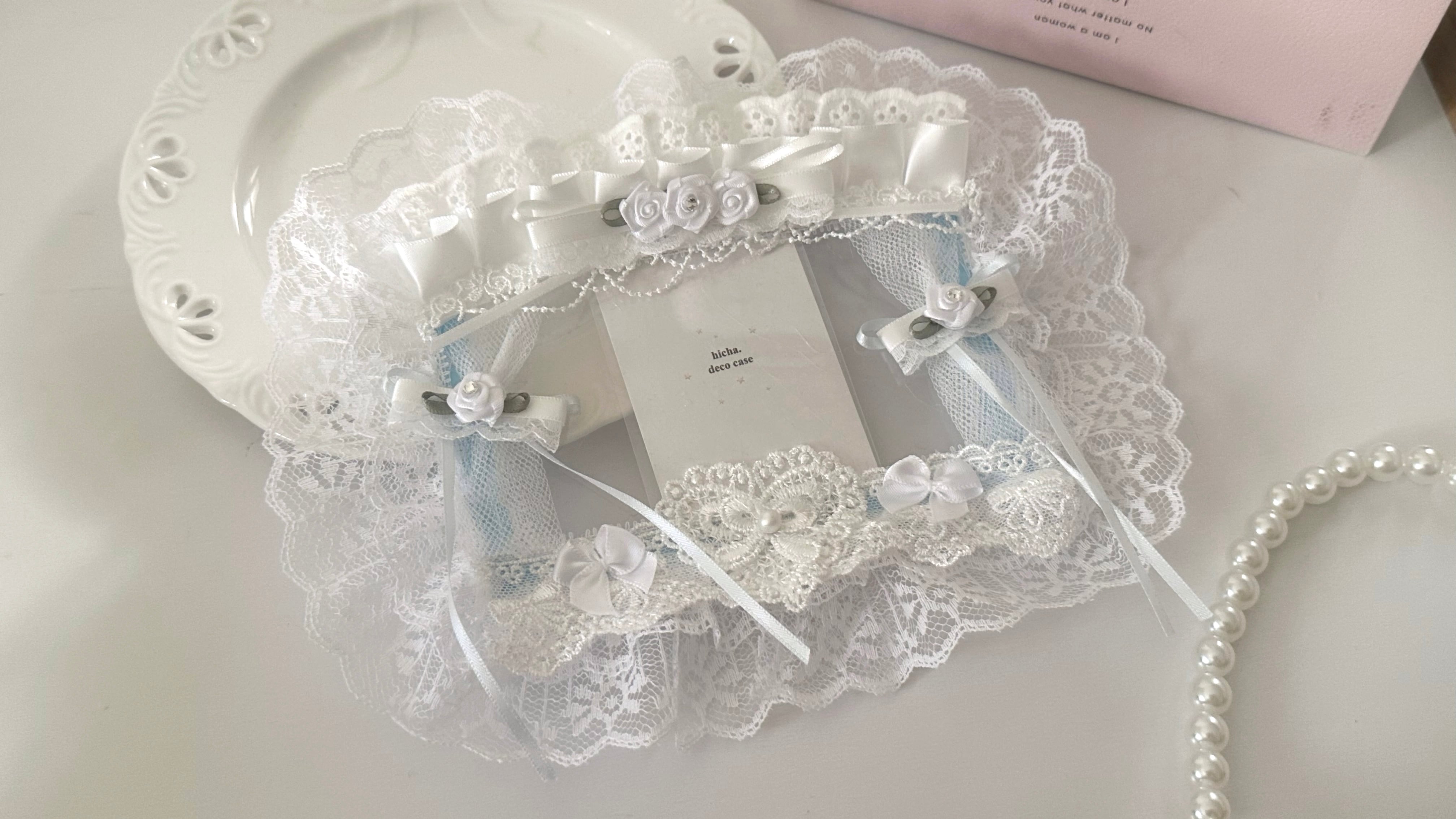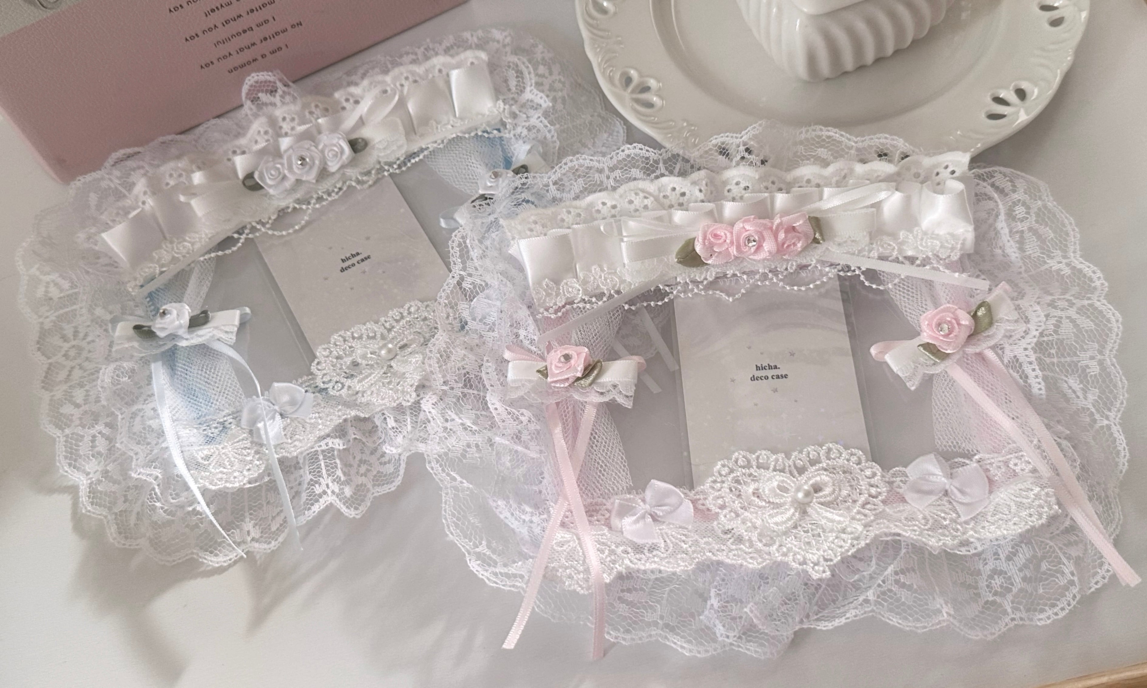 レースカーテンと、小さなローズをそっと添えた、ロマンティックなB7サイズのトレカケース。